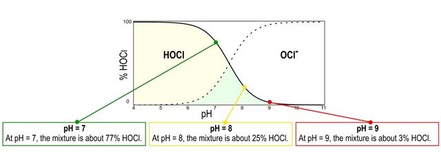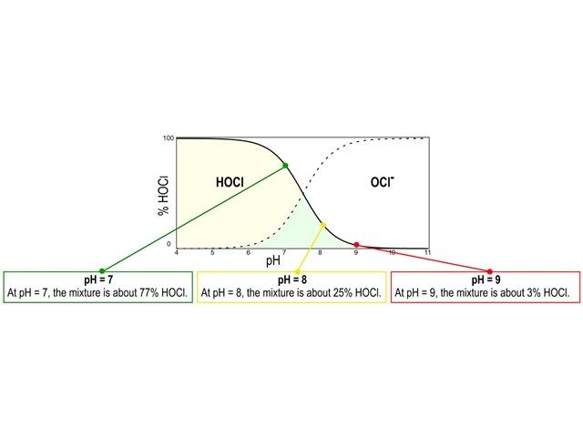 När klor (Cl₂) tillsätts till vatten bildas hypoklorsyra (HOCl) och hypokloritjon (OCl⁻). Termen "fritt klor" avser kombinationen av Cl₂, HOCl och OCl⁻ som finns i lösningen. HOCl är den dominerande biocida agenten, det vill säga det ämne som "dödar" de patogener som kan finnas. Alla amperometriska mätningar av fritt klor mäter enbart förekomsten av HOCl. HOCl reduceras på mätningselektroden, vilket genererar en ström som instrumentet översätter till en koncentration av fritt klor. Systemets pH avgör vilka ämnen som finns och i vilka proportioner, vilket illustreras i diagrammet. Vid ett pH över 8 finns en mycket liten mängd HOCl i lösningen, vilket gör amperometrisk detektion av fritt klor till en mer utmanande process. Vid pH = 7 består blandningen av cirka 77 % HOCl, vilket är idealiskt för mätning. Vid pH = 8 består blandningen av cirka 25 % HOCl. Vid pH = 9 består blandningen av endast cirka 3 % HOCl. Mätningar vid detta pH-värde kommer att vara utmanande och kräver rätt utrustning.