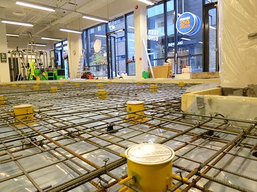 GERBs produkter för flytande golv med ingjutna stålfjädrar i en betongplatta utgör idag det senaste och bästa inom isolering av träningscenter där extremt höga krav ställs. Typiska verksamheter är gym och CrossFit hallar där tunga fria vikter används. Ett flytande golv innebär att man placerar höljen till stålfjädrarna och armering på byggplast. Betongen gjuts på byggplasten för att den ska vara frilagd från underlaget och på så sätt “flyta” ovanpå. När betongen brunnit klart sätts stålfjädrarna på plats och när de expanderar lyfts betonggolvet från marken. Stålfjädrarnas extremt höga vibrationsdämpande förmåga skyddar kringliggande utrymmen från vibrationer och skador.