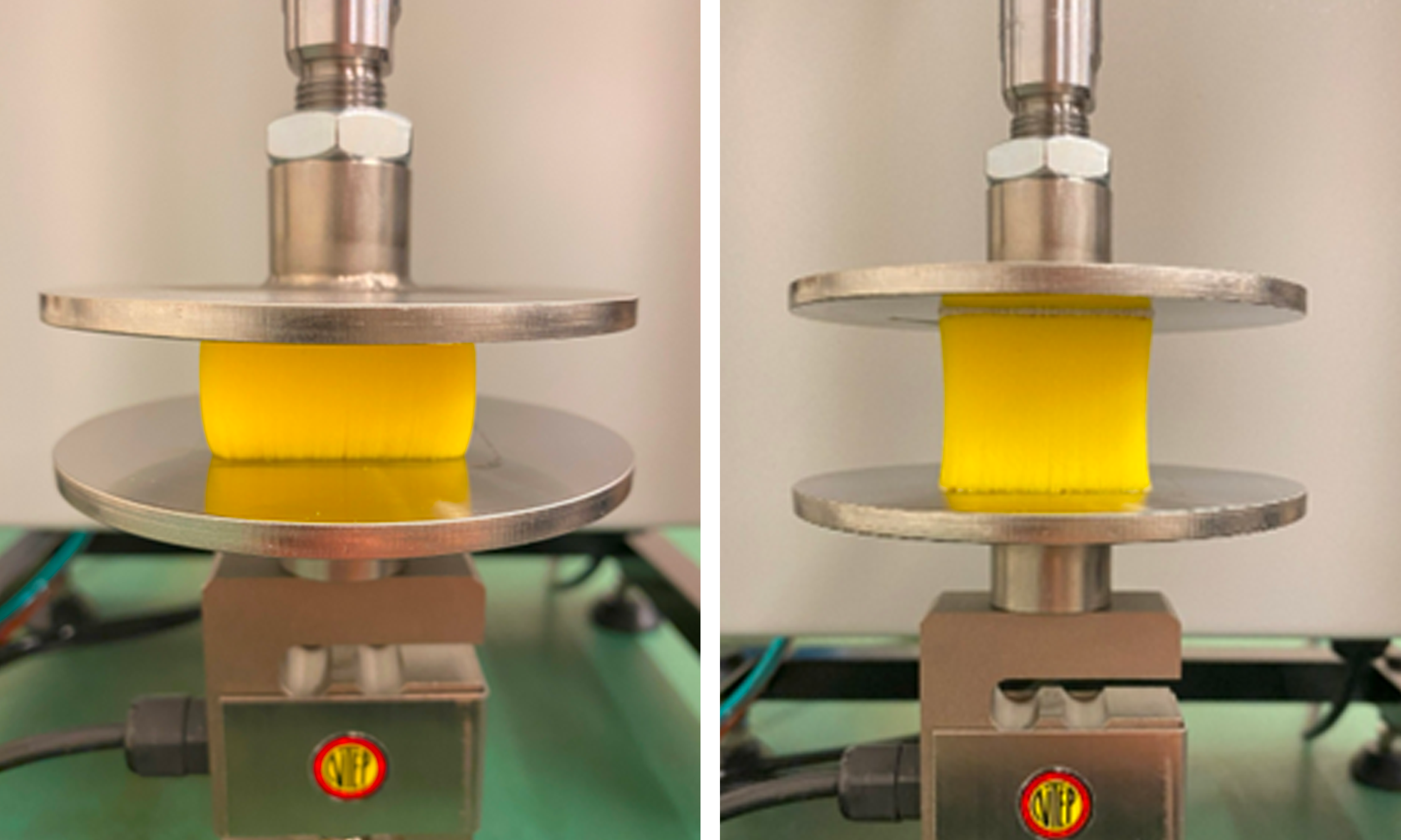 Klossen pressas först samman i ett hållfasthetstest som simulerar belastning i verklig användning.