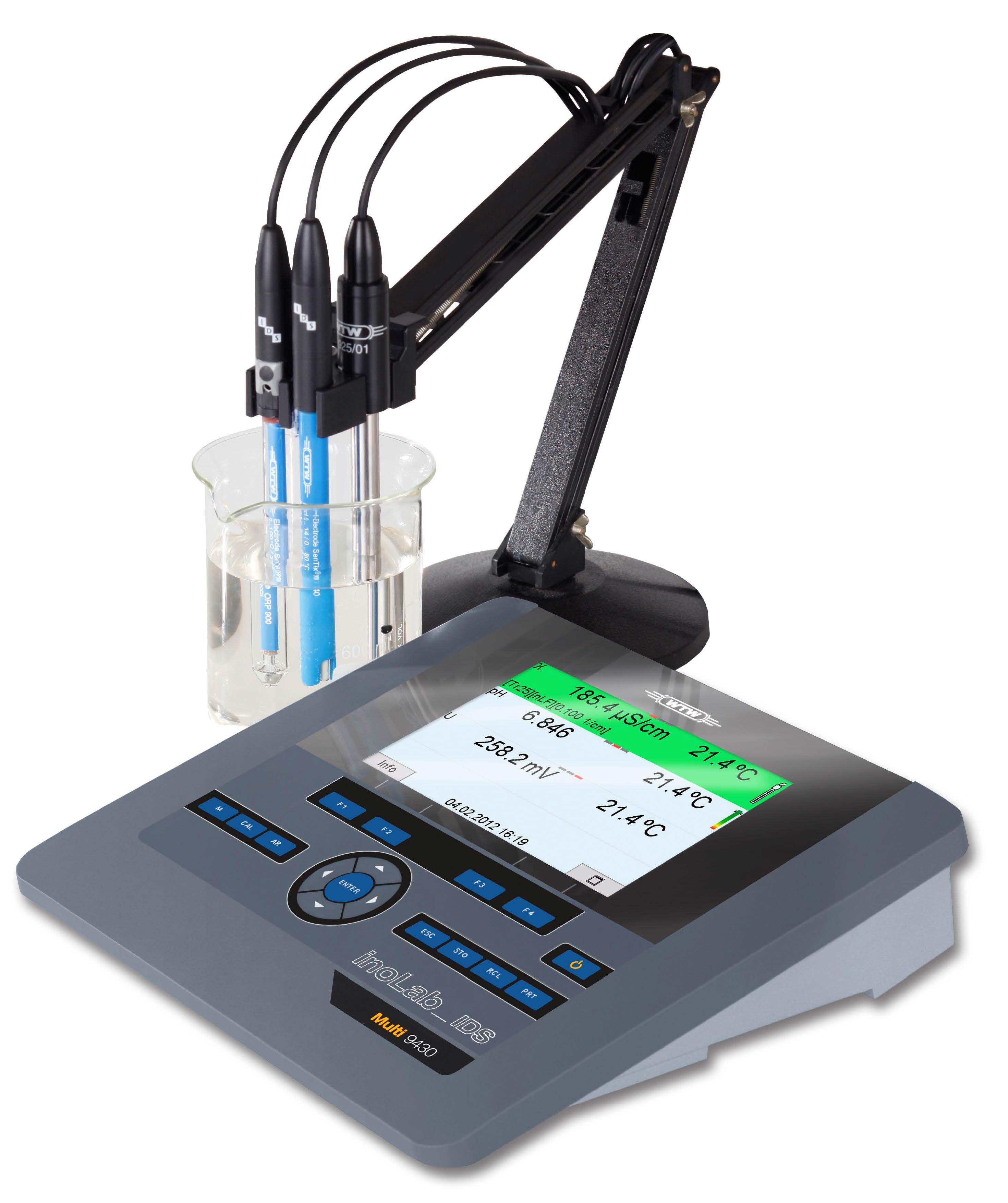 Digitalt bordsinstrument för labbruk. Multiinstrumentet har två alternativt tre kanaler för samtida anslutning av pH-, ORP-, konduktivitet- eller syre (optisk)-sensor.