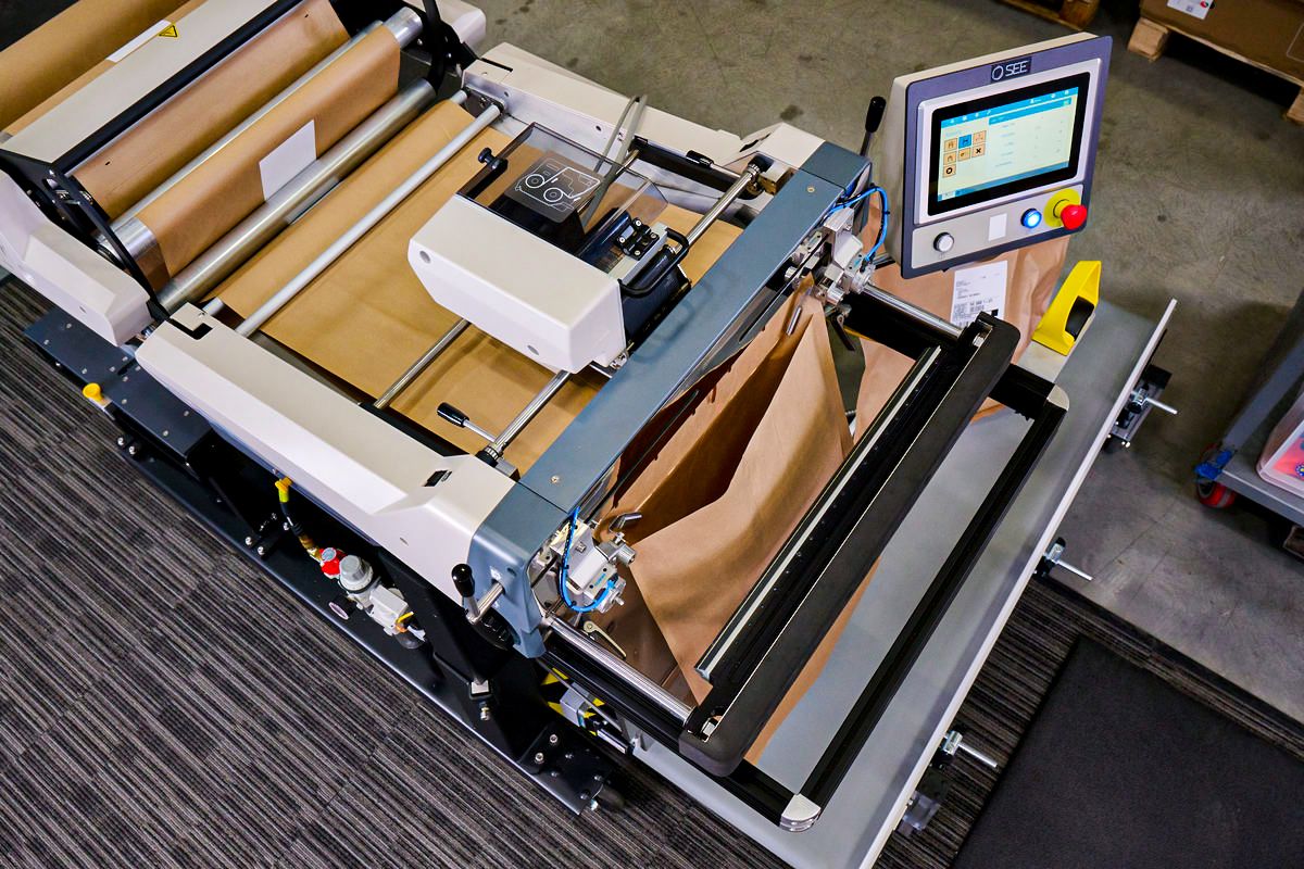 En påsmaskin som packar i 100% återvinningsbara papperspåsar för
